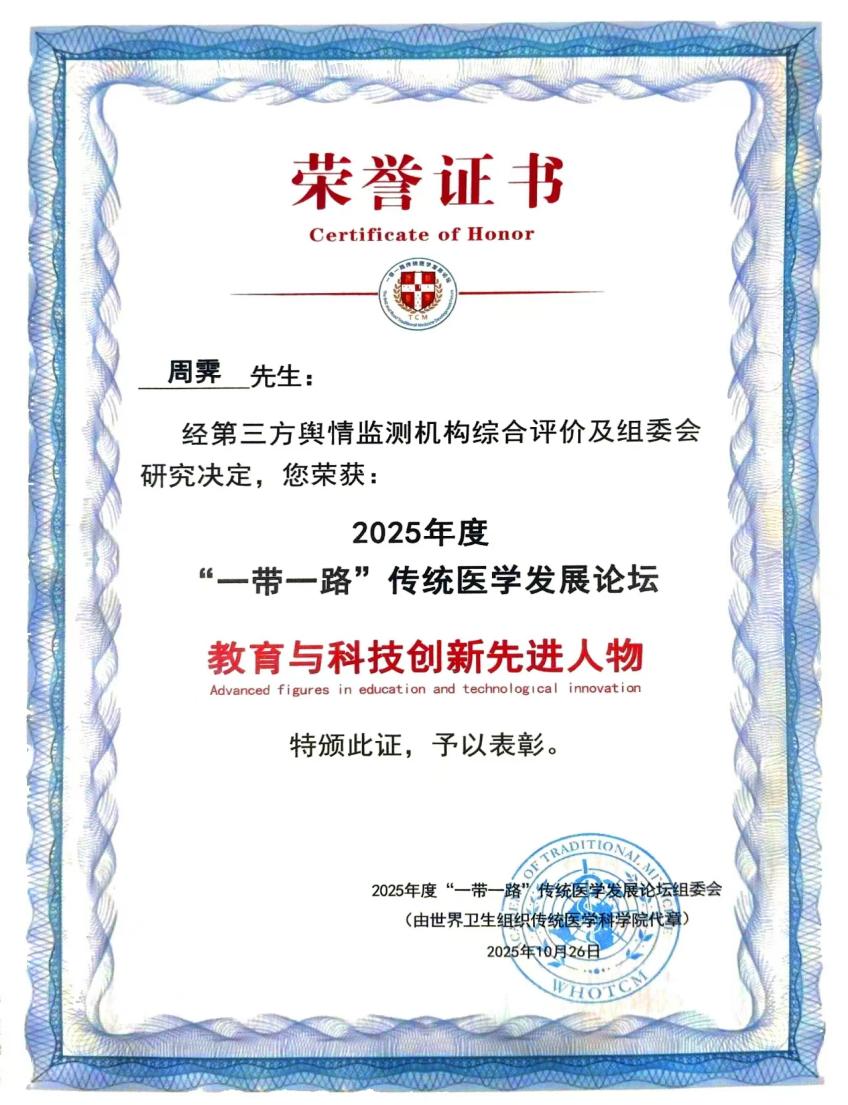Mohammad Shahbaz, Vice President of the WHO Academy of Traditional Medicine Sciences, presented the "Advanced Individual in Education and Technological Innovation" Award to Professor Zhou Ji. The award recognizes his dedication to research on the component extraction and dosage form development of natural medicines, with his research results actively applied to experimental teaching.